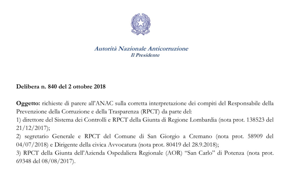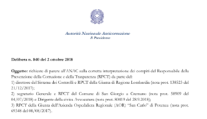 L’Autorità nazionale anticorruzione con un’unica deliberazione (link in fondo alla pagina) risponde a tre diversi quesiti aventi, in comune, lo stesso argomento: quali sono gli obblighi del Responsabile anticorruzione in caso di segnalazione di un illecito ? E in particolare: compete al RPCT un’attività di controllo sugli atti, laddove si segnali una eventuale loro irregolarità?
